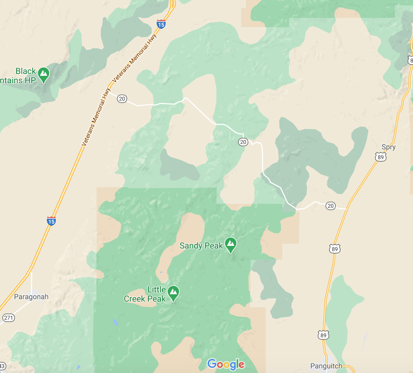 Looking at a terrain map, this area is ideal for a connection between 15 and 89 because although a continuous mountain chain still separates the two routes, this region is right between the high Tushars to the north and the Markagunt Plateau to the south, and so it provides an opportunity to cross the mountains at a much lower elevation. Case in point: the modern SR 20 has a summit elevation of 7900 feet, whereas the next state route crossings to the north and south (153 and 143 respectively) both reach well over 10,000 feet.